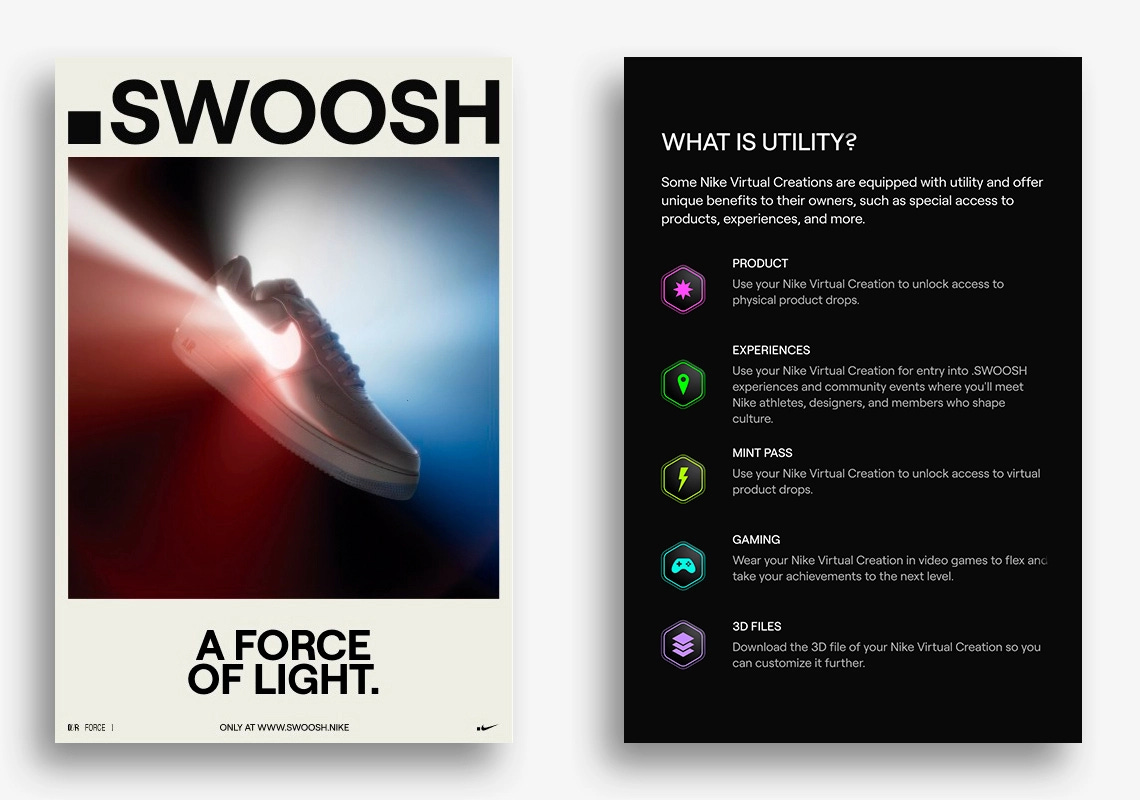 For example, Nike has released an NFT-sneaker collection for select users of their .Swoosh platform, called Our Force 1 (OF1), a play on the brand's iconic Air Force 1 design. The NFTs will grant them access to physical and virtual releases, brand experiences and a 3D file that holders can use to design and trade virtual Nike products, around Nike IP. Nike added that items purchased on .Swoosh can be worn in video games and other immersive experiences.